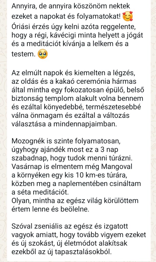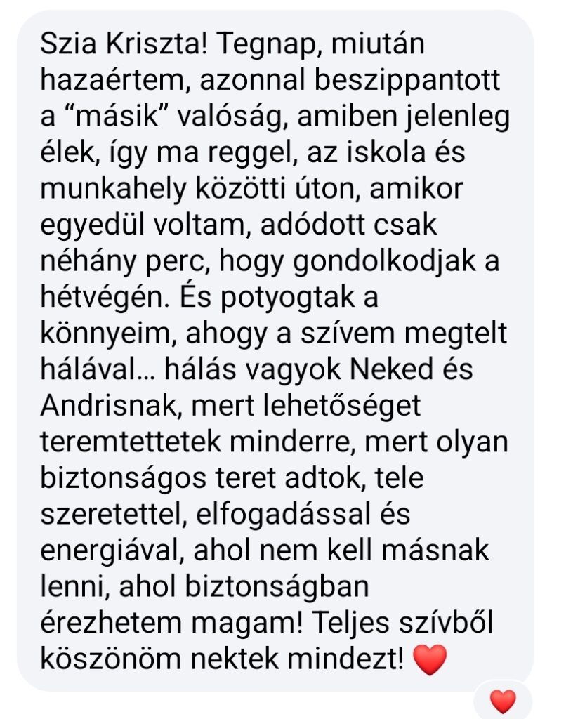 Az elmúlt évtizedekben megélt mélységek és magasságok – legyen szó akár az anyagiak, a család, a párkapcsolat, az önismeret vagy a spiritualtás területéről – mind hozzásegítettek ahhoz, hogy közelebb kerüljek ÖnMAGamhoz, segítői utamhoz és azokhoz a tapasztalatokhoz, amiket ma már a Párommal közösen megélve és megosztva, másokat is támogatni tudunk az útjukon, rátalálni önMAGukra, egyéni és párkapcsolati szinten egyaránt.